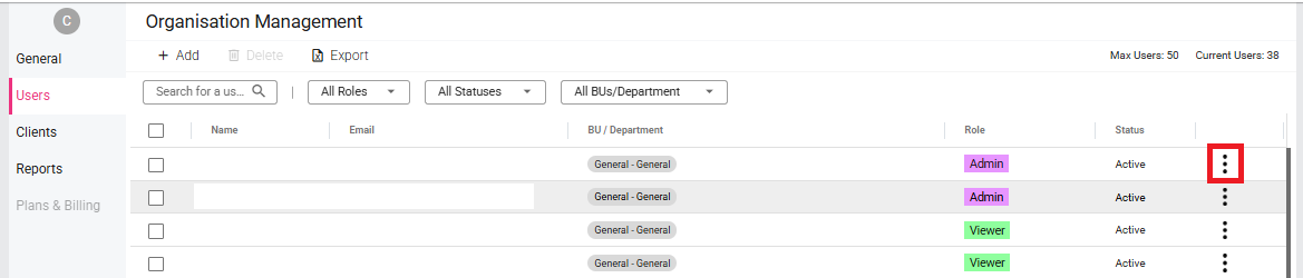 By clicking the three dots on the right side within the "User" screen, you can edit user details, resend invitation to users who have not yet registered, and change their account privileges (i.e. move them between Viewer, Content Manager, and Admin).